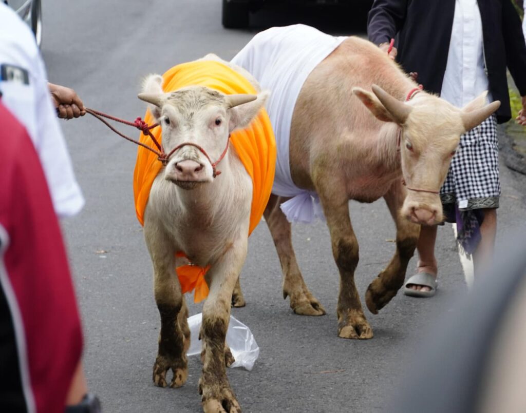 Sebagai bentuk dukungan, Wakil Gubernur Bali menyerahkan punia sebesar Rp25 juta, sementara Ibu Putri Suastini Koster menyumbangkan tiga ekor kerbau guna mendukung kelancaran pelaksanaan upacara.